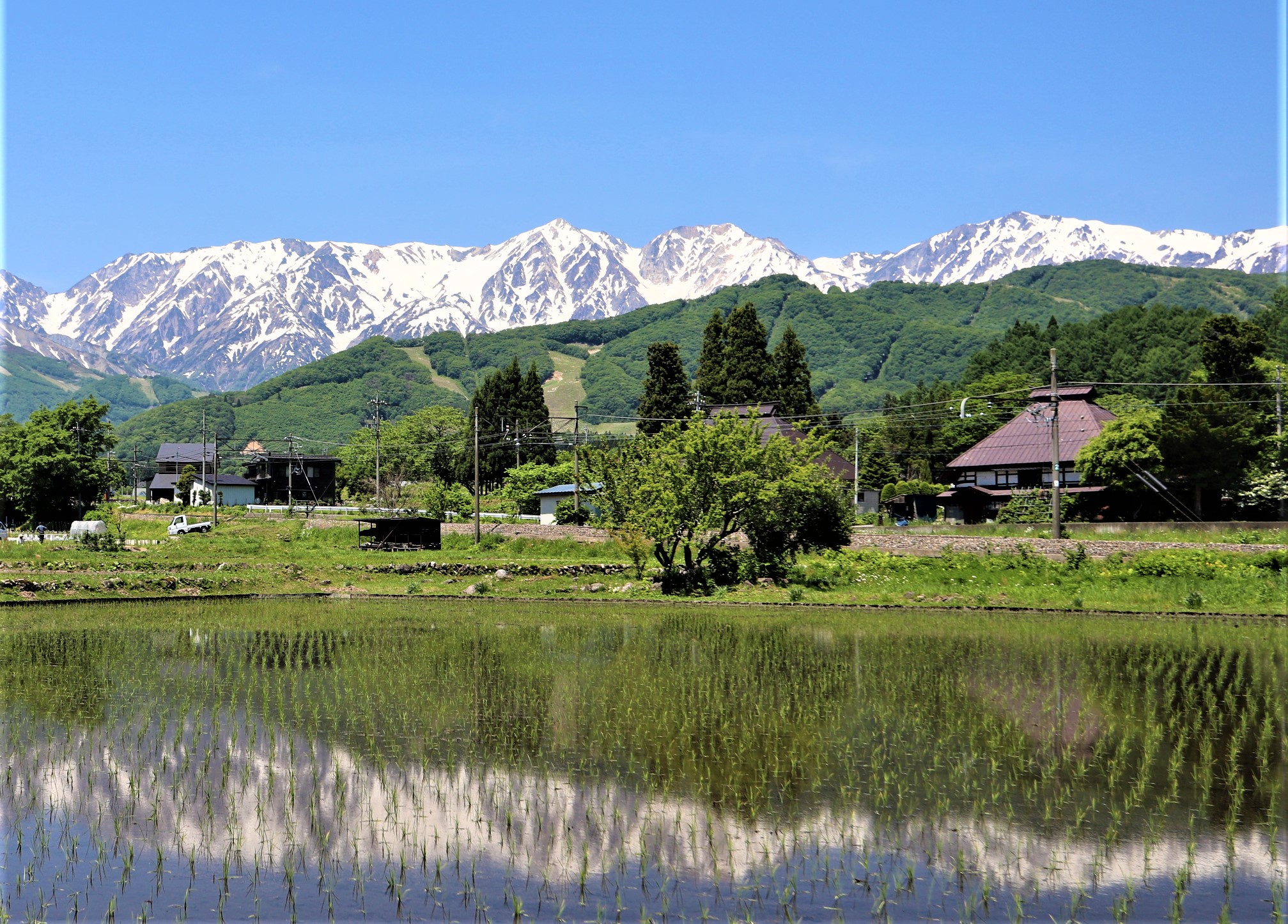 田んぼに映り込む白馬の山々