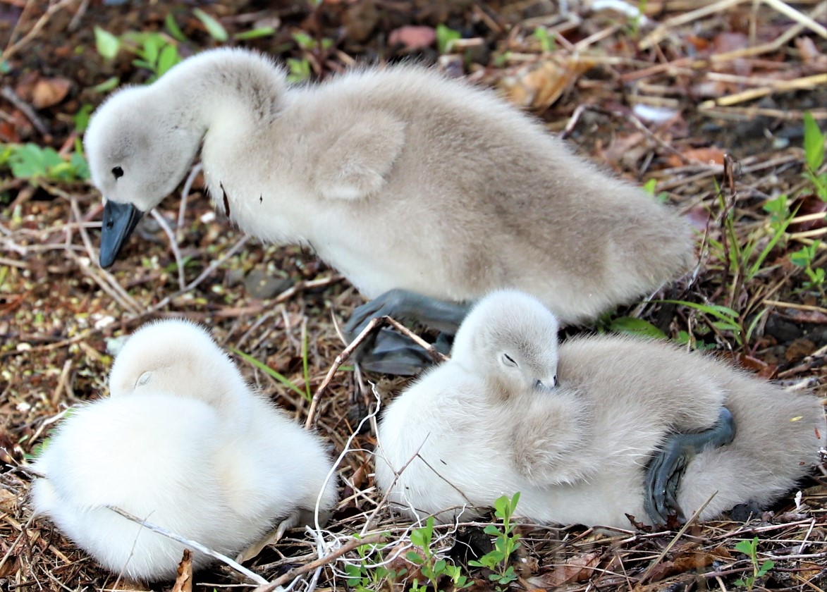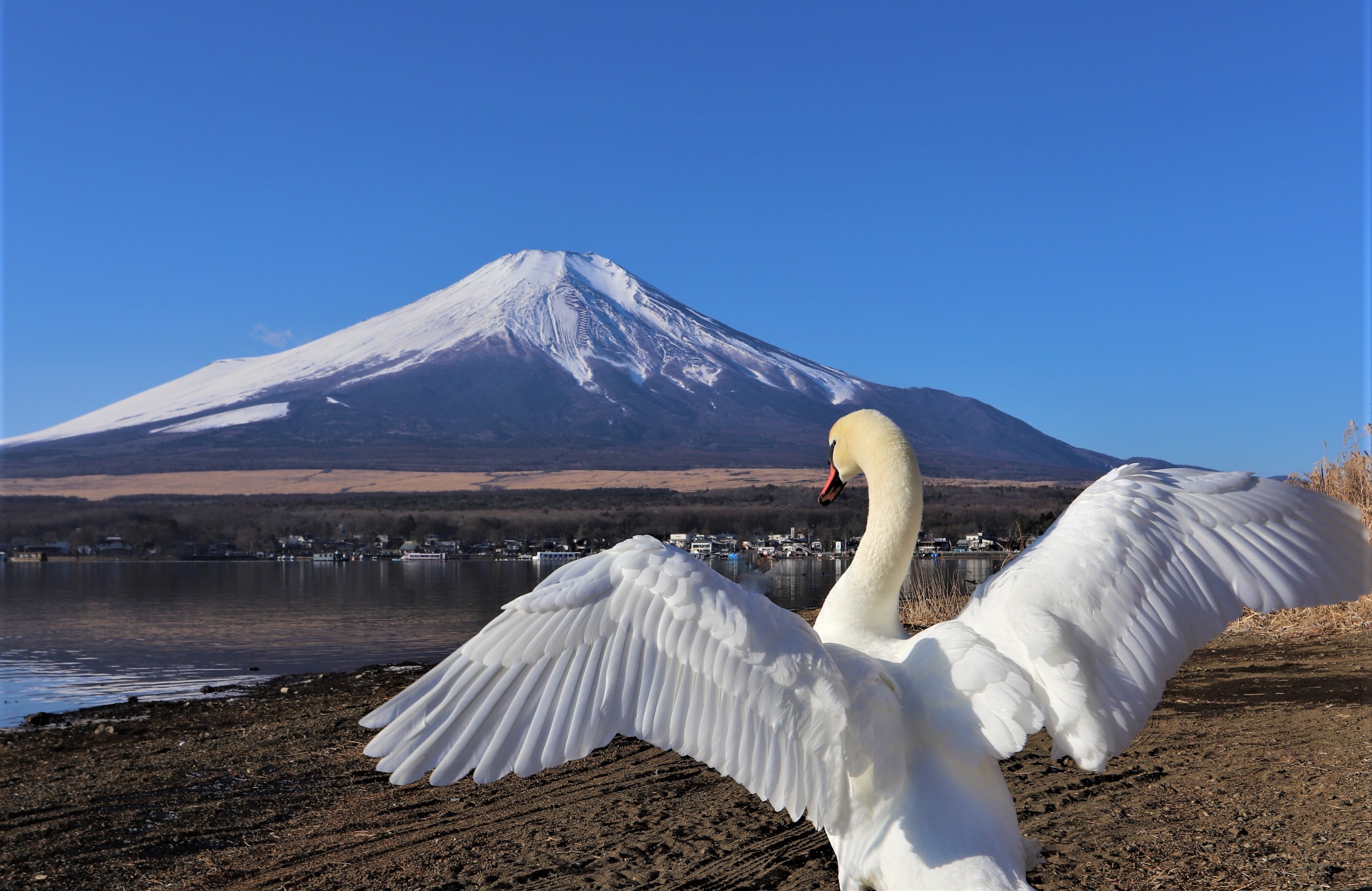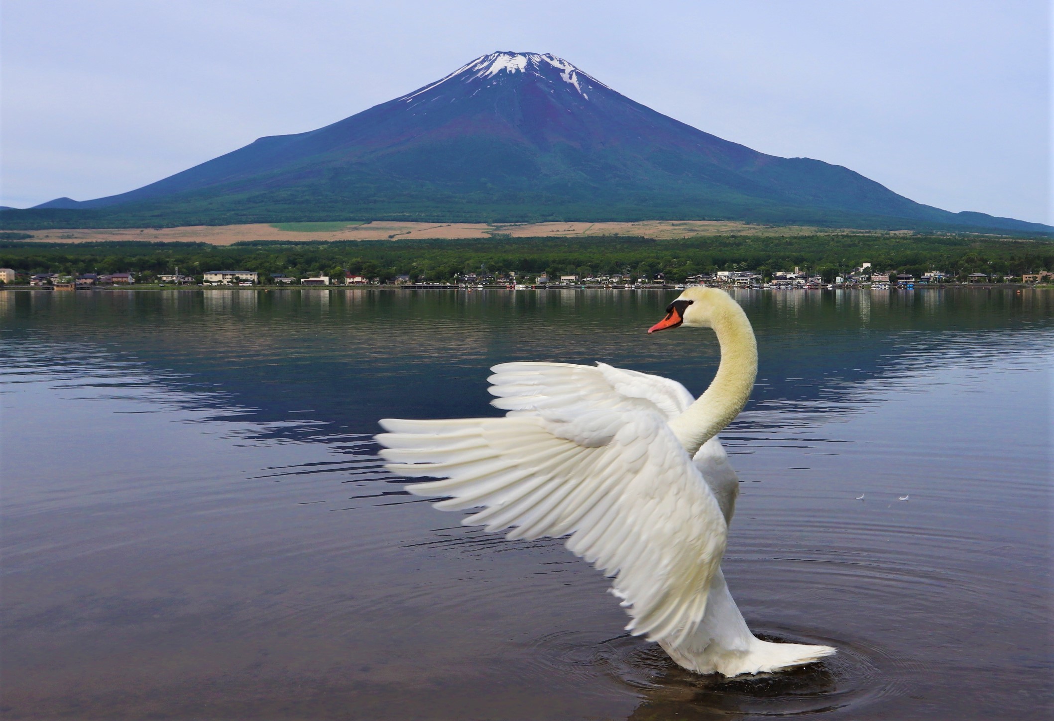 6月5日山中湖からの富士山と白鳥の子どもたち